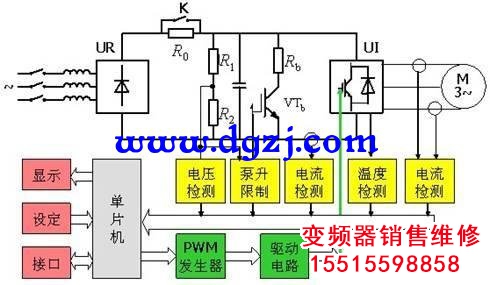 由整流,濾波,逆變,驅動以及微處理單元構成。一般通過驅動IGBT的開斷實現(xiàn)對輸出電壓與頻率的調整。實現(xiàn)調速與節(jié)能的功能。