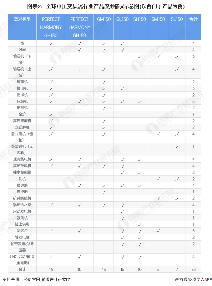 國際中壓變頻器供應(yīng)商大多可以提供個(gè)性化定制服務(wù),以助推公司產(chǎn)品可以適用于不同設(shè)備,從而拓寬變頻器產(chǎn)品需求邊界,為公司產(chǎn)品建立較高的技術(shù)應(yīng)用壁壘,形成產(chǎn)品獨(dú)特優(yōu)勢。以西門子中壓變頻器產(chǎn)品需求矩陣為例,其中壓變頻器產(chǎn)品涵蓋細(xì)分產(chǎn)品應(yīng)用多達(dá)29個(gè),其中在壓縮機(jī)等常用設(shè)備領(lǐng)域,相關(guān)覆蓋產(chǎn)品系列達(dá)到5項(xiàng)。