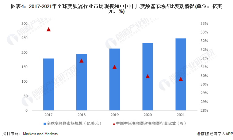 根據(jù)Markets and Markets統(tǒng)計(jì)數(shù)據(jù),2017-2021年全球變頻器行業(yè)市場規(guī)模呈現(xiàn)逐年上升趨勢。中國中壓變頻器市場規(guī)模占變頻器市場規(guī)模的30%上下,根據(jù)此比重,前瞻測算出全球中壓變頻器行業(yè)市場規(guī)模。